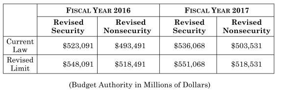 Subsection 101(a) amends section 251(c) of BBEDCA to increase the limits on discretionary spending for fiscal years 2016 and 2017. The revised levels for each category are shown in the table.